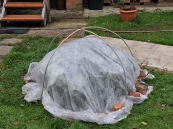 Odrasle visoke rastline niso upognjene, ampak samo ovijte z lutrasilom, ki je pritrjen z lepilnim trakom. Nato je okoli grma nameščen kovinski okvir, krog debla je pokrit s suhim listjem in pokrit s plastično folijo. Ob nastopu prve odmrznitve se zavetje razstavi, kar preprečuje gnitje grma.
