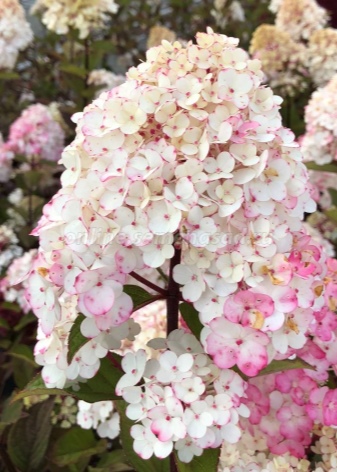 Na vrhu vsakega poganjka se razvije socvetje v obliki stožca. Njegova dolžina je 0,15 m, med cvetenjem se spremeni barva.Socvetje ima gosto notranjo strukturo. Socvetja vključujejo velike sterilne cvetove; po odprtju so bele barve, postopoma postanejo rožnate in nato rdeče.